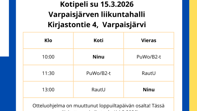Sunnuntaina 15.3.2026 pelataan kotiturnaus. Turnaus pelataan poikkeuksellisesti Varpaisjärvellä.