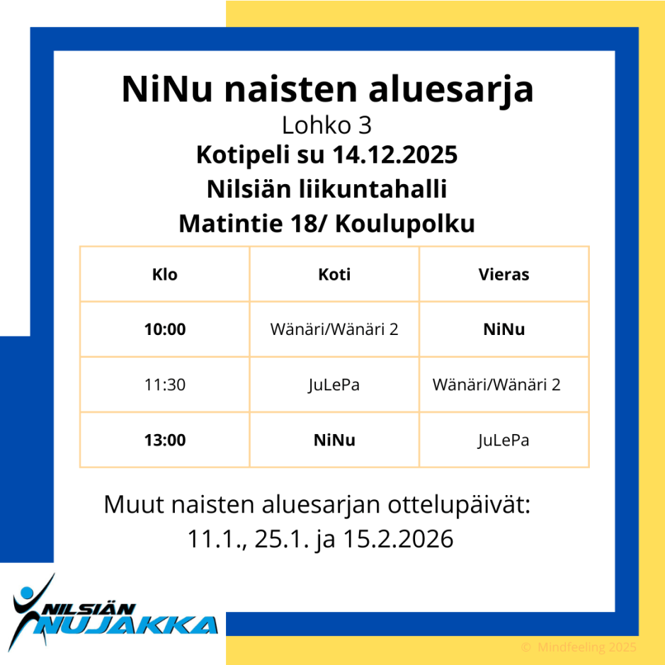 Sunnuntaina 14.12. on naisten aluesarjan peli ja vastaamme vieraaksi saapuvat joukkueet Wänäri/Wänäri 2 Kuopiosta ja JuLePa Iisalmesta. https://tulospalvelu.lentopallo.fi/team/57187/info